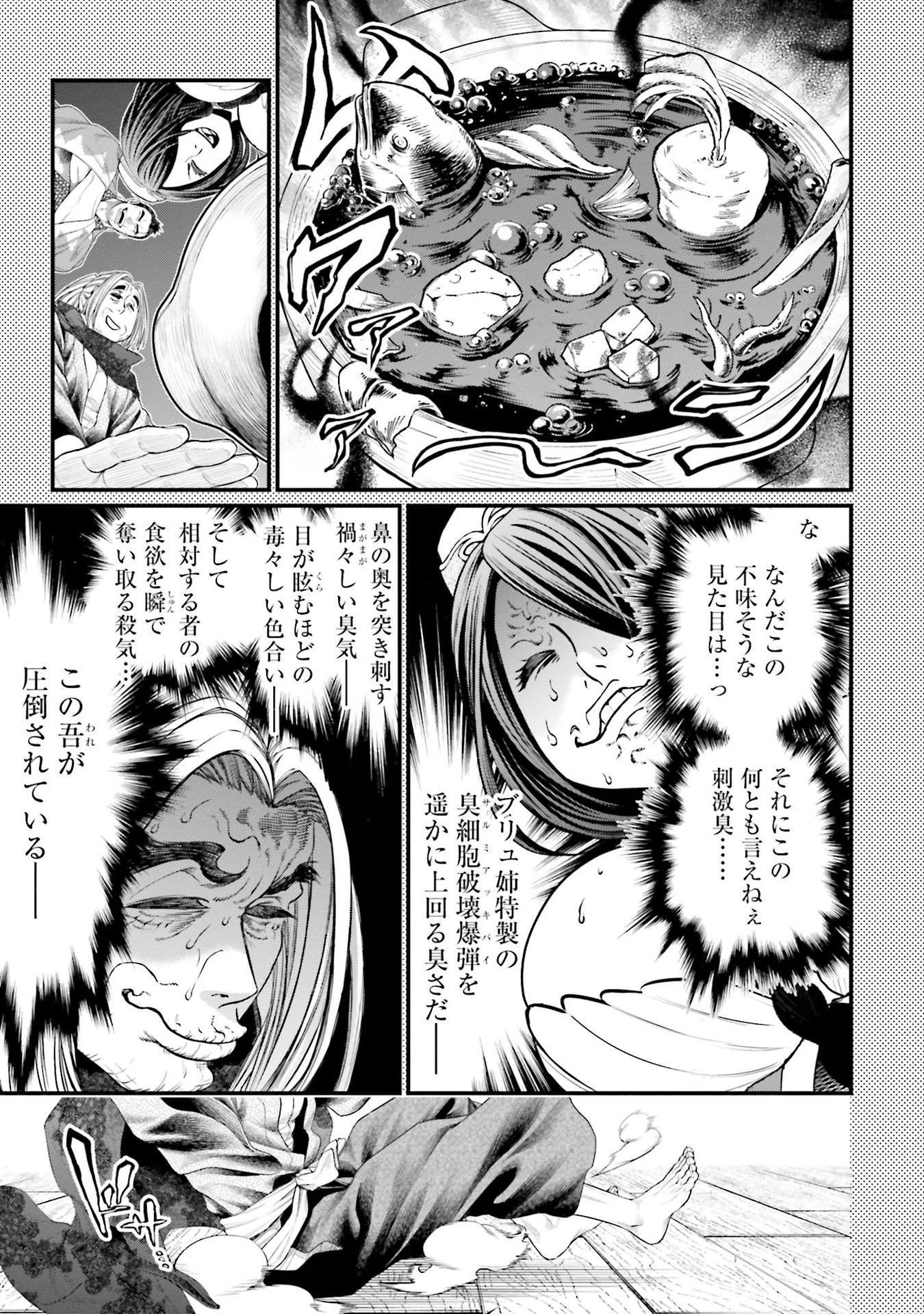 Enfin, Isami Kondo arrive avec un sourire sincère et s'excuse pour l'attente, puis s'approche de la table ronde et y pose un grand bol. Ce récipient contient une espèce de soupe à l'apparence infecte et à la couleur douteuse, où flottent un gros navet, du tofu, une tête entière de poisson, des racines difficiles à identifier, et de nombreuses bulles inquiétantes.